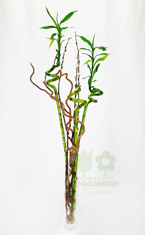Compuesto por tres tallos de Bambú de la Suerte (Dracaena Braunii), con jarrón de cristal incluido.